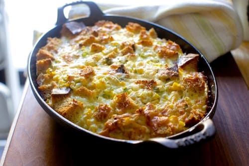 Corn, Cheddar, and Scallion Strata. A make ahead dish, and great for a crowd.