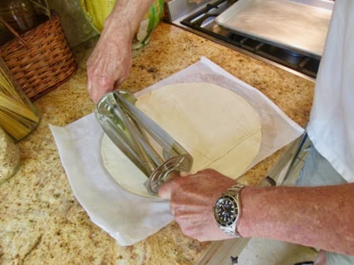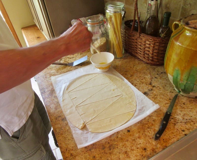 Ron had an inspired idea. Here one can buy wonderful ready-make pâte feuillité, which is like puff pastry in the states, but maybe a little thinner. You can use it like a pie crust or pizza crust, for a sweet or savory tart. It comes in a circle, rolled up and ready to go. “Let’s use that,” he said, “and roll it with the cutter. We’ll roll them into croissant shapes and put butter on them” (though butter is pretty redundant in this case). He even wanted to join me in this cooking adventure—a rare event.
