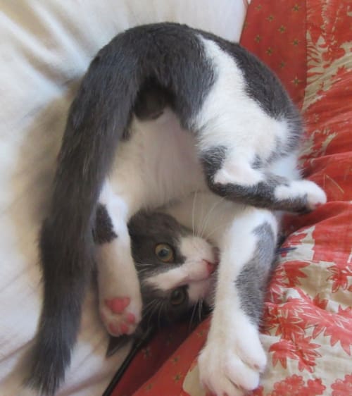 In this year's batch, there was one kitten early on that was different from the rest. Sociable and fearless, and absolutely manic: when he played he somersaulted, careened, tumbled, and lept joyously and with abandon, right into our hearts. He didn't get adopted right away, and then somehow before we realized it he was cuddled in our laps, nestled between us when we went to sleep, and had his own personal food bowl and toys. Christened 'Vino the Bambino', we now seem to have a permanent cat. Umm, I forgot to tell you the main drawback of fostering–there always seems to be one that sticks around!