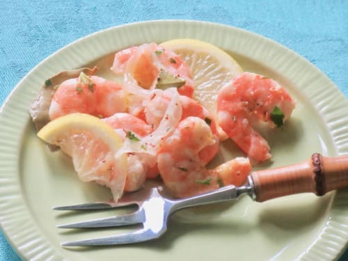Make the marinade with 1/2 cup olive oil, a generous dash of red pepper flakes, and 1/4 cup of lemon juice, a couple of cloves of chopped garlic, sea salt and pepper. Some chopped parsley is good if you have it. Mix well and pour it over shrimp. Let it marinate for at least a day, turning the container over or stirring often.