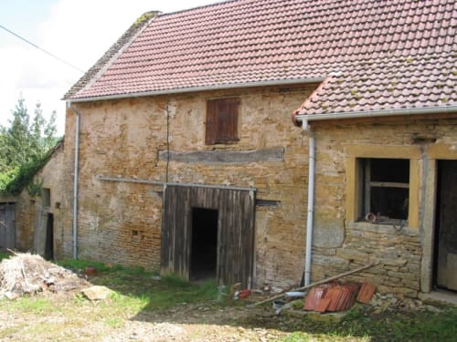 This house “ticked all the boxes”, as the Brits like to say. Great location 10 minutes from Cluny, in the middle of a quiet perched village and (bonus!) across from a gorgeous 14th century church. Mostly covered by aged crépi (stucco), there were hints of beautiful golden stone peeking through. It had a front covered galerie, a pigeionnier, a million dollar view, underground power lines. It had a large barn on one side with gates between house and barn, so it formed a sort of compound. The barn was big enough for cars and then some. The yard was a manageable size. Two other barns attached to the main house could be transformed into a grand great room. It faced south, very important in our climate. The price was unbelievably low.