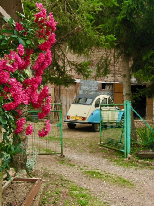 In a yard at Balleure, an iconic French Deux Chevaux.
