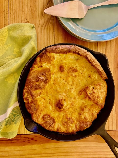 I must have been in my twenties when I clipped a recipe out of magazine for an “oven pancake puff”. I’ve been making it ever since, for breakfast or brunch. It’s a giant popover, basically, which you whip up in about 5 minutes, pour into a cast iron skillet, bake and serve to ooh’s and aah’s. It billows up then slowly collapses, a glorious presentation that makes it look like you’ve spent hours in the kitchen. I top it with a squeeze of lemon juice and a sprinkling of sugar, and it really dazzles with some sliced strawberries on top.