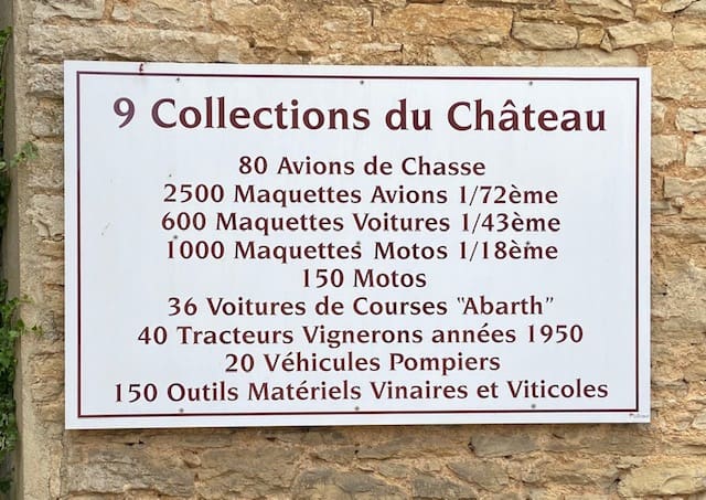 The sign reads: "80 fighter planes, 2500 model airplanes, 600 model cars, 1000 model motorcycles, 150 motorcycles, 36 race cars, 40 vigneron tractors from the 1950's, 20 fire trucks, and 150 vintage tools of the wine trade."