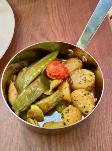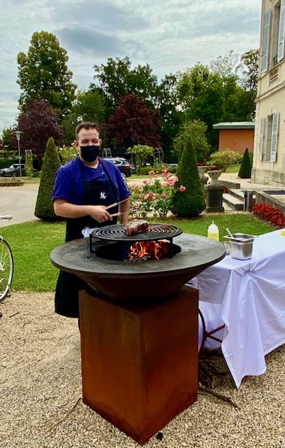 At a château there is space to spread out. Which is why, next to the pretty terrace dining at the Bistro, there was a potager, beside a tall pigeonnier (which were historically used for making compost from the pigeon droppings, for the potager). We were eating veggies right out of the garden. They also have a vineyard, and a fancy restaurant, and of course the hotel. And then there was le brasero.
