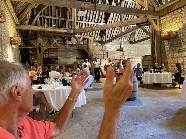 One memorable evening a while back we went to a small, country restaurant with our friends Jean-Marie (French) and Marion (Dutch). There were only two tables, quite close together: the four of us, and a party of 12, celebrating a birthday. Darn, there went our quiet evening, we thought. The raucousness started with the Ban Bourguignon (a clapping/chanting number that is a Burgundy classic) and escalated from there. One of the revelers jumped up and led us all in song, and pretty soon, after perhaps just a bit of wine, our group was singing and clapping right along with them. Eventually Jean-Marie abandoned us entirely and joined the French table!