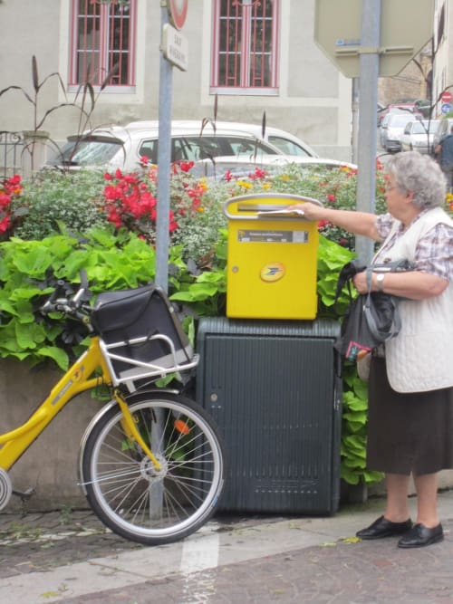 So on this happy day, time to share a bit of French joie de vivre. Let's look at the French boites aux lettres, and send a love letter to those quirky little details of life that make French village life so appealing. Even the official letter boxes of the French Poste are a bright, cheery yellow.