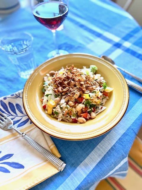 This is a rice salad with many vegetables, plus mango, an array of fresh herbs, cashews, fresh shaved coconut and fried shallots. Maybe this isn’t something you’d make on a weeknight, but it’s a great company dish.