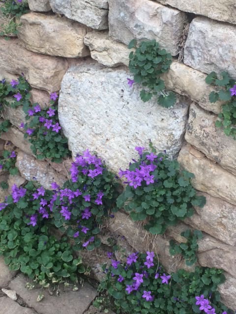 Forget-me-nots peek from a stone wall with careless gaiety…