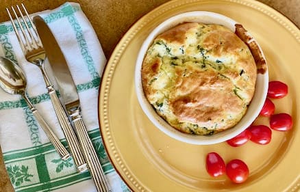 In love or not, I’ve had mixed success with soufflés. This time I read several recipes first, and sort of combined them. I ramped up the flavor, with mustard and garlic and spinach. And I am happy to say I nailed it on the first try.