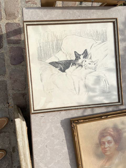 A pair of cozy felines, spotted at a flea market