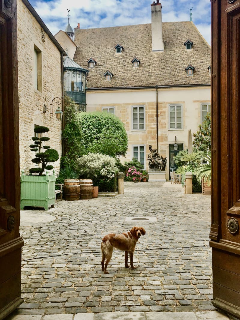 Let's start with les chiens. In the photo above: On a street near us in Beaune, there are big heavy wooden doors which occasionally swing open to reveal the most wonderful of courtyards, guarded by this cutie, although he doesn't look very ferocious.