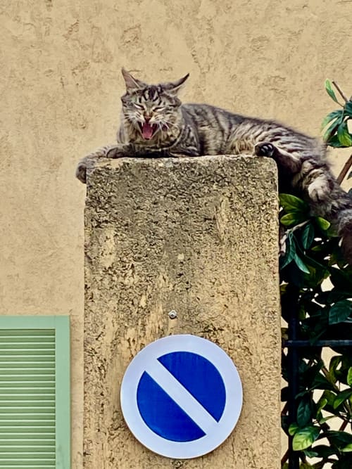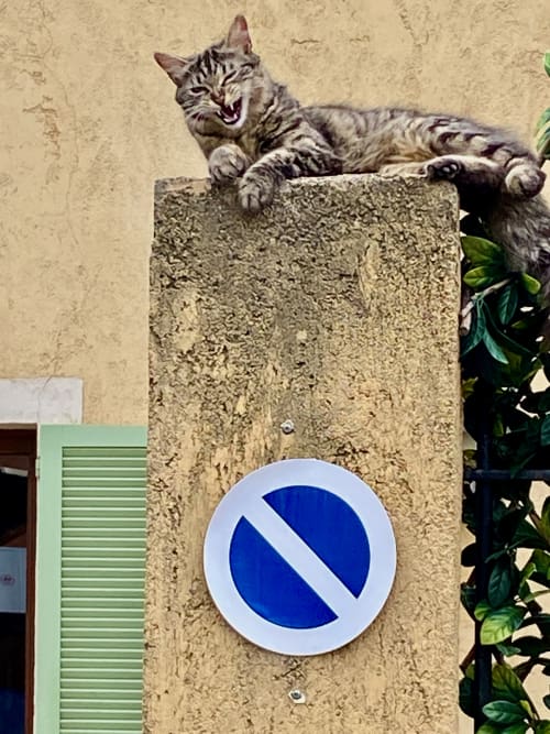 When we were staying near Nice this year, this cat lived in our neighborhood and entertained us every time we passed his perch. No, he's not snarling; he's a lazy bum, and those bared teeth are from a yawn.