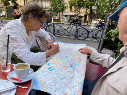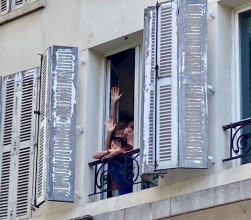 "We shared space with our group in three airbnbs scattered around Parmentier in the 11th. Like most Parisians living with too many people in too-small apartments, we depended on Paris’ welcoming neighborhood parks and corner cafes for our living rooms and backyards. Each morning early risers could spill out of the apartments to the cafe below to plot our day over café au lait and pain au chocolat. Quelle routine! As others got up, they could lean out the window to see what progress was being made on the planning. The picture below was taken looking up from our café at a few of the jet-lagged late risers.