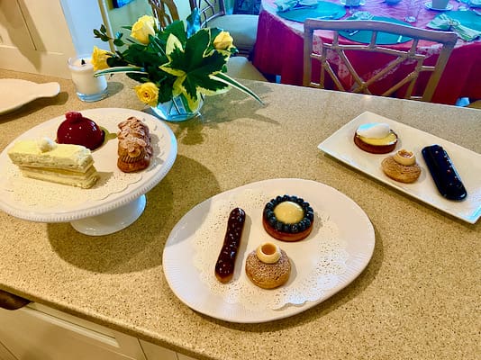 I hit on an idea, which was to have a French pastry tasting. With enough friends, we could sample them all. I put them on display, then we cut them into bite sized pieces and we had a bite of each. A Pastry Flight, if you will. I accompanied them with French vin d’orange, and it was a great way to spend a winter afternoon. Now I will repeat this at home with French friends.