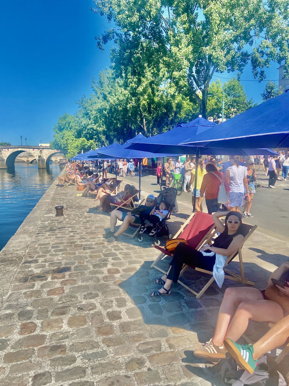The swimming spot, roped off in a wide, quiet corner of the river, was quite small, about the size of an Olympic swimming pool. They had built a nice deck, with gates at each end. Cheerful young folks manned the gates; 100 people at a time was the limit, and there was a line. They informed everyone that we were welcome to come in for a brief dip, but if we wanted to lounge and lay in the sun, the Paris Plage was nearby.